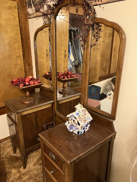 - antique walnut vanity tri-fold mirror
